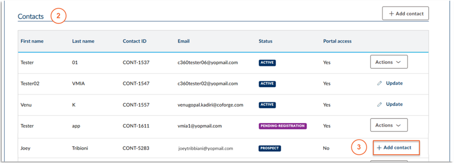 - Click the ‘Update’ button to the right of the contact's name (or if the contact is still pending registration, select the ‘Actions’ drop-down and then click ‘Update’).